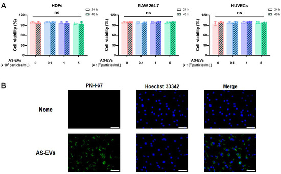 Cytotoxicity and intracellular delivery of AS-EVs. (A) Cytotoxicity of AS-EVs in HDFs, RAW 264.7 cells, and HUVECs, respectively. After 24 h and 48 h treatment with AS-EVs, viability was measured by trypan blue exclusion assay. (ns: not significant, n = 3) (B) Uptake of AS-EVs into HDFs. HDFs were incubated for 8 h in a growth medium containing PKH-67 green fluorescent dye-labeled AS-EVs, and then observed under a fluorescence microscope. Scale bar indicates 100 μm.