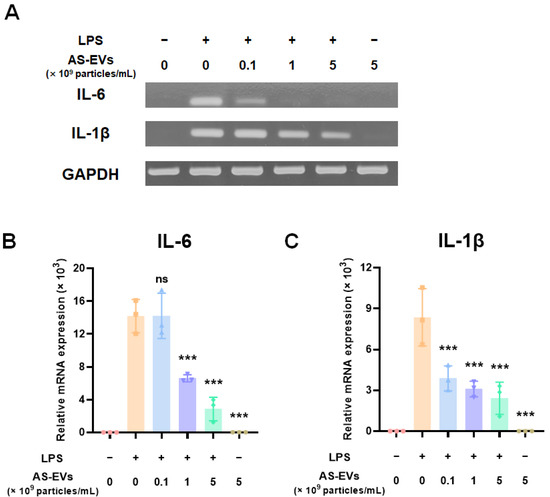 Effect of AS-EVs on expression of pro-inflammatory cytokines in LPS-stimulated RAW 264.7 cells. (A) RT-PCR analysis of IL-6 and IL-1β mRNA expression in AS-EV-treated cells followed by induction of inflammatory response by LPS treatment. (B,C) The mRNA expression levels IL-6 and IL-1β in AS-EV-treated cells were quantitatively analyzed by qPCR analysis. AS-EVs reduced the expression of LPS-induced pro-inflammatory mRNAs. Statistical significance was determined by comparison with the control group not treated with AS-EVs (*** p < 0.005, ns: not significant, n = 3).