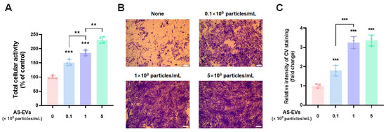 We next investigated the effect of AS-EVs on the migration of HDFs by a transwell migration assay. HDFs plated on the upper membrane of the transwell can migrate to the opposite side of the membrane, and migration can be detected by staining cells on the bottom with CV [19]. The results revealed that migration of HDFs was significantly promoted by treatment with AS-EVs at various concentration up to 5 × 109 particles/mL of AS-EVs (Figure 4B). Quantitative analysis of CV staining also demonstrated that the stimulatory effect was increased by AS-EVs, and the migration of cells treated with 1 × 109 particles/mL was increased more than three-fold compared to the non-treated controls (Figure 4C). Taken together, our results indicate the potential of AS-EVs to accelerate the wound-healing process by promoting the proliferation and migration of HDFs.
