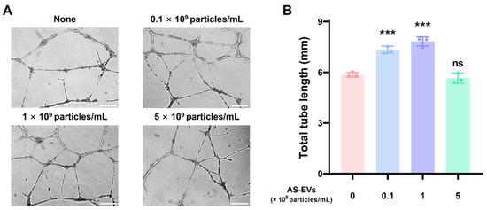 Effect of AS-EVs on the capillary-like tube formation of HUVECs. (A) Representative image of HUVEC tube formation. HUVECs plated on Matrigel-coated wells were treated with AS-EVs for 16 h in EGM-2 medium. Scale bar indicates 200 μm. (B) Total tube length (mm) was measured using ImageJ software. Statistical significance was determined by comparison with the control group not treated with AS-EVs (*** p < 0.005, n = 3).