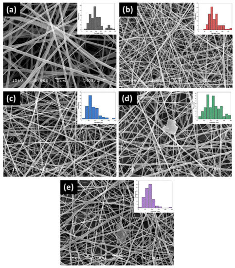 SEM images of electrospun nanofibers from (a) PGC, (b) PGC-3, (c) PGC-5, (d) PGC-10 and (e) PGC-15 nanofibers at 6000 magnifications. The insets show the fiber diameter distributions. Scale bar: 2 µm.