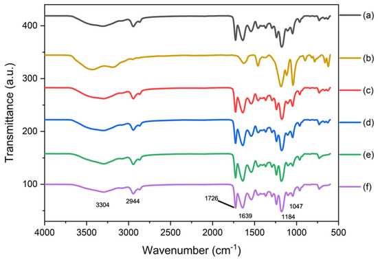 FTIR spectrum of (a) PG, (b) SCX4, (c) PGC-3, (d) PGC-5, (e) PGC-10, and (f) PGC-15.