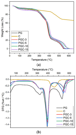 Weight loss of PG and PGC nanofibers (a) TGA, (b) DT.