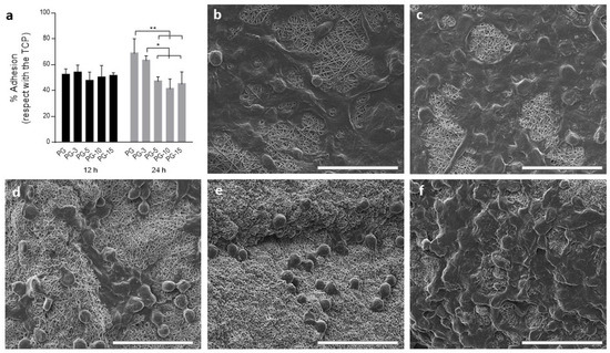 Cell adhesion of L929 cells. (a) Quantitative evaluation after 12 and 24 h in in vitro culture calculated as percentage of adhered cells with respect to the tissue culture plate (TCP, 100%). Results are presented as mean ± standard derivation. * p < 0.05, ** p < 0.01; (b–f) qualitative evaluation of cell adhesion via SEM on PG, PG-3, PG-5, PG-10, and PG-15, respectively. Scale bar: 50 µm.