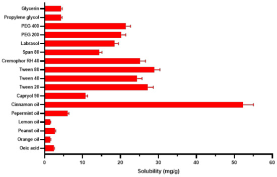 The capability to dissolve considerable drug amounts is crucial to select the oil component of nanoemulsions, particularly for orally administered ones. If the surfactant and cosurfactant noticeably contribute to drug solubilization, dilution in GIT could lower their solvent ability and precipitate the drug. The aqueous solubility of TDL was found to be 0.01 ± 0.009 mg·g−1. Results of solubility study are graphically displayed in Figure 2. Amongst tested essential oils, the highest solubility of TDL was observed in cinnamon essential oil, i.e., CEO (52.3 ± 2.7 mg·g−1), while its least solubility was in lemon oil (1.49 ± 0.11 mg·g−1). CEO was also successfully selected as the lipid component of SNEDDS due to its solubilizing potential for a number of drugs such as rosuvastatin calcium [50] and candesartan cilexetil [51]. Higher oil solubility of poorly water-soluble drugs helps stabilize formulations with efficient dose optimization and cost-effective delivery [52]. A lesser amount of CEO will be required to solubilize TDL doses with the reduction of any possible unwanted actions of the essential oil. Besides good solvent capacity, CEO and its major compound, cinnamaldehyde, were found effective to induce relaxation in human and rat corpus cavernosum, improving erectile functions [53]. The chosen surfactant should decrease the interfacial tension to assist the dispersion process throughout nanoemulsion formulation. Owing to their relatively low toxicity, a variety of hydrophilic nonionic surfactants with a relatively high HLB, such as labrasolTM, polysorbates (Tween®), and polyoxyls (Cremophor®), have been extensively used in SNEDDS formulations [13]. In this study, Tween® 80, Tween® 20, Cremophor® RH 40 (CR), Span® 80, and labrasol were selected for emulsification study, as they showed good solubility potential for TDL. Findings of the % transmittance and the number of flask inversions (ease of emulsification) revealed that CR showed the highest emulsification ability towards (Table 3). The addition of appropriate cosurfactant improved spontaneity of emulsification via reducing the interfacial tension, fluidizing the hydrocarbon region of interfacial film, and decreasing the bending stress of interface [54]. Besides its good solubility potential for TDL, PEG 400 showed highest emulsification ability toward CEO (Table 3). Based on the previous findings, a system composed of CEO, CR, and PEG 400 as the oil, surfactant, and cosurfactant, respectively, was selected for further studies.