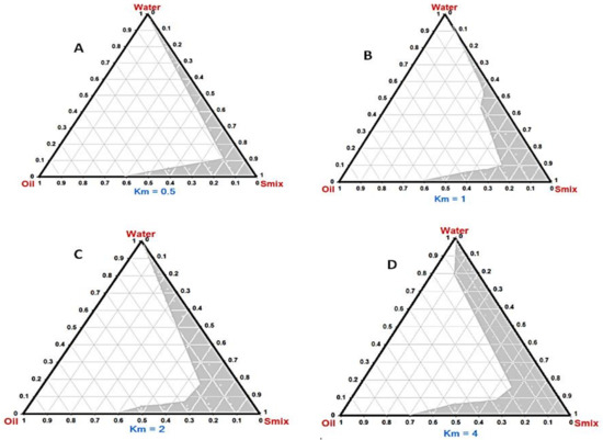Phase diagrams were constructed to demarcate the regions of nanoemulsion and to determine the plausible ratios of surfactant/cosurfactant for the generating of a stable SNEDDS. The phase diagram is comprised of 100% of oil, Smix, and water in each corner (Figure 3). A larger shaded region signifies superior nanoemulsifying capability. Components were converted to mass percent (w%) prior to creating phase diagrams. Generally, nanoemulsification was found to be promising at a low level of the oil. The addition of surfactant and cosurfactant enhances the efficiency of emulsification owing to their higher hydrophilicity characters. SNEDDS prepared with Km = 4 (Figure 3D) showed more pronounced self-nanoemulsifying capability relative to other Km values, suggesting optimum emulsification gained by this ratio. At the proper Km ratio, packing of surfactant and cosurfactant at the o/w interface will be effective to reduce the interfacial tension and enhance fluidity of the interface [55].
