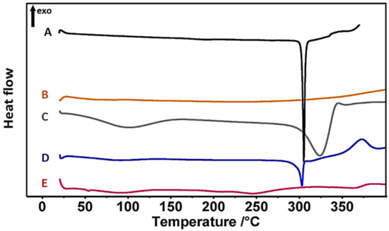 Thermal properties of the TDL-SNEGS, unprocessed TDL, carriers, and the physical mixture were studied using DSC. TDL presented a sharp endothermic peak at 304 °C (Figure 4A), confirming the crystalline nature of the drug [63]. Silicon dioxide did not generate any endothermic peaks, suggesting its amorphous nature [62] (Figure 4B). MCC showed two endothermal peaks (Figure 4C). The first shallow, broad peak in the scanned region between 60 °C and 145 °C indicates desorption of water from the cellulose materials, while the second peak (325 °C) corresponds to melting or thermal decomposition of MCC [64]. The physical mixture showed a similar peak corresponding to TDL (Figure 4D). Nevertheless, no distinctive TDL peak was identified in solid SNEG thermogram at the studied temperature (Figure 4E), implying drug amorphization.