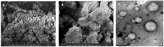 Scanning electron micrographs of tadalafil-loaded SNEGS: (A) ×120 and (B) ×1000; TEM image of reconstituted SNEG (C).