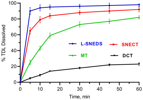 The in vitro drug dissolution profile of TDL-SNECTS compared to L-SNEDDS, tablets of unprocessed drug (DCT), and marketed tablets (MT) was studied (Figure 8). DCT showed a poor dissolution pattern with a maximum TDL dissolved value of 14% in 15 min. MT, which contains sodium lauryl sulfate acting as a solubilizing agent [68], displayed a drug release up to 59% in the same time. On the other hand, both SNEDDS formulations showed faster drug dissolution profiles (95% and 84% within 15 min for L-SNEDDS and SNECT, respectively). The quicker drug release from SNEDDS formulations is related to the spontaneous formation of nanoemulsions with a large surface area, the molecular dispersed state of drug, as well as wetting and high solubilization capacities of surfactant and cosurfactant mixtures [14,48]. In Figure 8, it was also noticeable that TDL dissolution from SNECT formulation was marginally slower than L-SNEDDS formulation. A plausible explanation is the type of dosage form. Additional steps of tablet disintegration and then desorption of liquid SNEDDS from the excipients surface are required prior the emulsification process. Moreover, excipients such as silicone dioxide still have their impact on the adsorbed SNEDDS, affecting the rate and extent of TDL release [62]. Nonetheless, such a small difference in drug release between L-SNEDDS and SNECT suggests that SNECT retained the self-nanoemulsifying character and the consequent ability to enhance dissolution of TDL.
