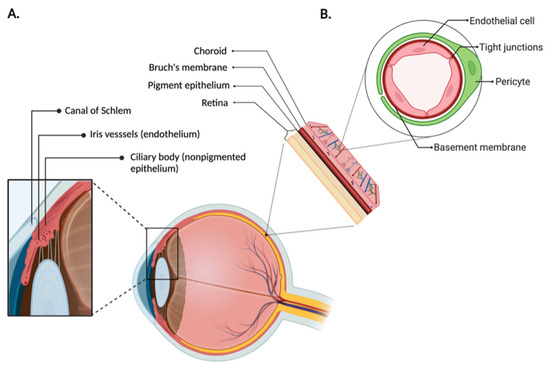 Anatomical barriers of the eye. (A) In the anterior of the eye, the blood–aqueous barrier, consisting of the iris/ciliary blood vessels and nonpigmented ciliary epithelium, limits access to the anterior of the eye and prevents therapeutic entry to the intraocular environment. (B) In the posterior of the eye, the blood-retinal barrier, comprised of the retinal capillary endothelial cells and retinal pigment epithelium cells, prevents therapeutics from entering the posterior segment from the bloodstream.