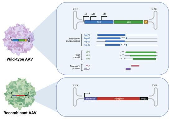 Schematic of the wild type and recombinant AAV genome. The wild type AAV genome comprised four known open reading frames, rep (blue), cap (green), MAAP (burgundy), and AAP (purple), flanked by inverted terminal repeats (ITRs, grey color). The rep gene encodes four regulatory proteins: Rep78, Rep68, Rep52, and Rep40. Cap gene encodes viral proteins, VP1, VP2, and VP3. Rep and cap genes are removed from the genome of recombinant AAV, instead the transgene expression cassette was inserted, flanked by ITRs. Created with BioRender.com.