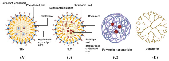 The structure of organic nanoparticles (NPs). (A) Solid lipid nanoparticles (SLNs) range from 50 to 1000 nm and consist of a solid crystal lipid core that is stabilized by surfactant, which acts as an emulsifier. Rather than a simple phospholipid bilayer, the exterior of an SLN feature a bilayer of physiologic lipids, such as triglycerides and cholesterol. (B) Nanostructured lipid carriers (NLCs) range from 30 to 100 nm in size and have a similar outer layer to SLNs and contain a surfactant that acts as an emulsifier, but they utilize an irregular solid lipid crystal matrix and a liquid lipid (oil) core. (C) Polymeric nanoparticles range from 1 to 1000 nm. They utilize a polymetric core that can be loaded with active compounds to produce countless variations of the nanoparticle. (D) Dendrimers are organic polymers, which consist of a central core from which ‘branches’ extend outwards to form a spherical shape. They range from 1 to 10 nm in size.