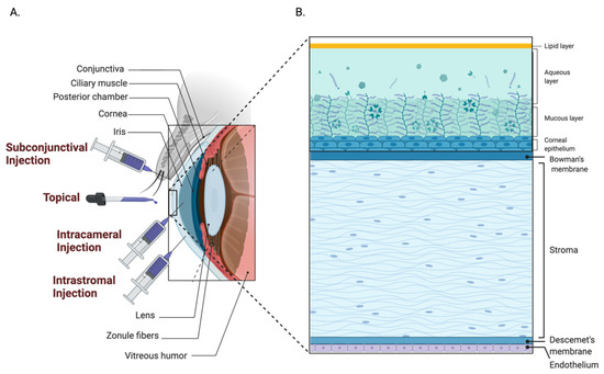 Drug administration routes to the anterior segment of the eye. (A) Subconjunctival injections are a type of periocular route of administration where the drug is injected under the conjunctiva (epibulbar) or underneath the conjunctiva lining the eyelid (subpalpebral). Intracameral injection delivers medication directly to the anterior chamber/aqueous humor of the eye. Topical administration is most used in drop form and delivers the solution to the exterior of the eye. Intrastromal injection administers the drug directly to the thick, fibrous stroma of the cornea. (B) Figure 3B depicts the layers of the tear film and cornea. The tear film stretches from the lipid layer to the mucous layer and the cornea from the corneal epithelium to the endothelium.