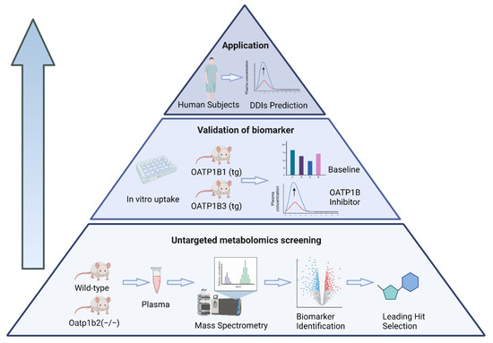 The SLC class of organic anion transporting polypeptides (OATPs) is of particular interest in connection with DDI predictions, as these uptake transporters are highly expressed in various organs of elimination of relevance to a rapidly increasing number of clinically important drugs [7]. In humans, the family members OATP1B1 and OATP1B3 (collectively referred to throughout as ‘OATP1B’) are expressed on the sinusoidal membrane of hepatocytes, and these proteins play key roles, either individually or collectively, in the hepatic uptake of many drugs [8,9,10]. In scenarios where this process is rate-limiting, the inhibition of OATP1B can lead to defective elimination, result in sudden increases in the plasma concentration for drugs that are substrates of these transporters, and ultimately increase the risk of therapy-related side effects [11]. Based on these considerations, both the US Food and Drug Administration and the European Medicines Agency stipulate, under certain conditions, that sponsors perform studies to evaluate whether new investigational small molecule drugs have intrinsic OATP1B-inhibitory properties. Although endogenous substrates of OATP1B have been previously proposed as biomarkers to predict OATP1B-mediated DDIs [3,4,12,13], further validation studies are warrant to conclusively demonstrate their utility as a substitute for traditional DDI studies. One potential reason underlying this limitation resides in the fact that the specificity and sensitivity of most proposed biomarkers have not been directly demonstrated. In an attempt to eliminate observer bias in biomarker selection, we describe here the results of a bottom–up, untargeted metabolomics screening approach for OATP1B biomarker discovery in various transporter-deficient and humanized transgenic mouse models and validated lead hits in mice and human subjects receiving OATP1B modulators of varying inhibitory potency (Figure 1).