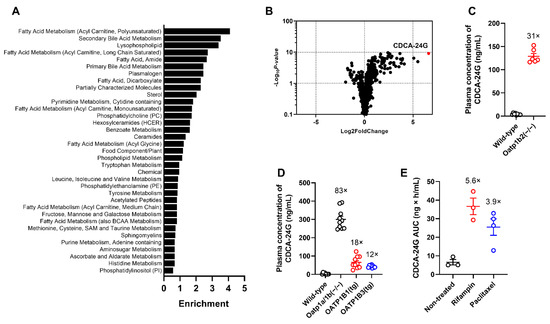 To demonstrate the direct modulation of hepatic OATP1B function following the administration of OATP1B inhibitors, the identification of sensitive and selective biomarkers is required to guide the selection of optimal doses and schedules to be used in polypharmacy regimens and avoid potentially harmful DDIs. We hypothesized that this can be accomplished by probing for naturally occurring metabolites that are increased in plasma samples of untreated Oatp1b2(−/−) mice, the single murine homologue of human OATP1B1/3, by conducting untargeted metabolomic analyses using MS/MS-based platforms. A preliminary analysis of this metabolomics screen indicated that the observed metabolite profiles in the plasma of wild-type mice and Oatp1b2(−/−) mice were discriminative in a principal component analysis (Figure S1A). The differential metabolites among mouse genotypes were predominantly related to primary and secondary bile acid metabolism and fatty acid metabolism after pathway enrichment analysis (Figure 2A and Figure S1B). Consistent with previous reports indicating that certain primary and secondary bile acids are transported substrates of OATP1B-type transporters [21,22], we found that several of such bile acids had substantially increased circulating levels in Oatp1b2(−/−) mice (Figure 2B). Of the 919 compounds with detectable levels in mouse plasma, 198 (21.5%) showed higher plasma concentrations in Oatp1b2(−/−) mice (Table S1). The largest increase (≈98-fold vs. wild-type mice based on semi-quantitative analysis) was observed for CDCA-24G, which is a glucuronic acid conjugate of chenodeoxycholic acid that was previously reported to be a transported substrate of OATP1B1 and OATP1B3, and explored for clinical characterization [20,23]. For these reasons, CDCA-24G was selected for further validation studies in vitro and in vivo.
