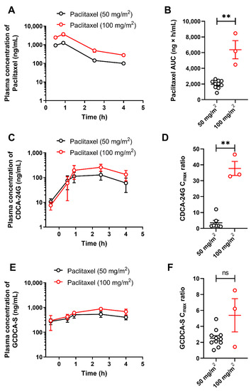 Influence of paclitaxel (Taxol) on OATP1B biomarkers. Plasma concentrations (A) and AUCs (B) of paclitaxel in patients after i.v. infusion of paclitaxel at a dose of 50 or 100 mg/m2. Plasma concentrations (C) and Cmax to baseline ratio (D) of CDCA-24G, and plasma concentrations (E) and Cmax to baseline ratio (F) of GCDCA-S in the same patients, ** p < 0.01, (n = 3–11). All data are presented a mean ± SEM.