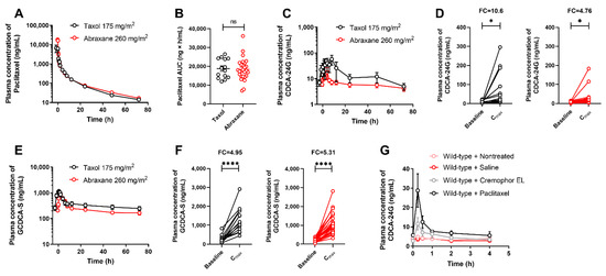 Influence of paclitaxel formulation on OATP1B biomarkers. (A) Plasma concentrations of paclitaxel and (B) AUC of paclitaxel in patients after i.v. infusion of Taxol (175 mg/m2) or Abraxane (260 mg/m2). (C) Plasma concentrations of CDCA-24G, (D) plasma concentration of CDCA-24G at baseline and Cmax in patients receiving Taxol or Abraxane. (E) Plasma concentrations of GCDCA-S, (F) plasma concentration of GCDCA-S at baseline and Cmax in patients receiving Taxol or Abraxane, * p < 0.05; **** p < 0.0001, (n = 13–26). (G) Plasma concentrations of CDCA-24G in untreated wild-type mice, or after receiving saline (5 mL/kg, i.v.), Cremophor EL/ethanol (1:1, v/v, 5 mL/kg, i.v.), or paclitaxel (Taxol; 10 mg/kg, 5 mL/kg, i.v.), (n = 3–5 per group). All data are presented as mean ± SEM.