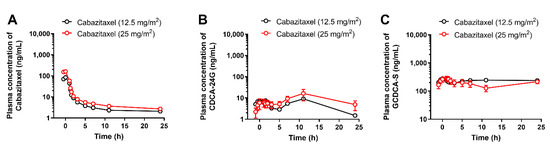 For a biomarker to be considered clinically useful, the magnitude of its dependence on a particular transport mechanism should be sufficiently significant to allow for differentiation between weak, moderate, and strong inhibitors of the transporter in question. To address this issue for CDCA-24G, we next performed analyses on samples obtained from human subjects receiving the antineoplastic taxane cabazitaxel. Unlike paclitaxel [28], the degree to which OATP1B-type transporters contribute to the cellular uptake of cabazitaxel is controversial [28,29,30], and cabazitaxel is not anticipated to inhibit these transporters at concentrations associated with the approved dose of 25 mg/m2 [31]. In line with this prior information, we found that the administration of cabazitaxel (up to 25 mg/m2) to patients was not associated with elevated plasma levels of CDCA-24G and GCDCA-S (Figure 5).