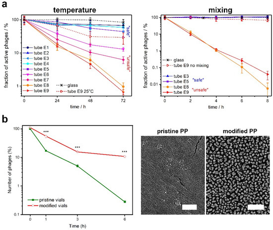 The absorption of bacteriophages on plastic surfaces. (a) A comparison of absorption of phages on different types of plastic surfaces enhanced by temperature and mixing [95]. (b) The reduction in phage absorption on polypropylene vial surface upon covering with gold-polyoxoborates nanocomposite (*** p < 0.001) [97]. Panels were adapted from Richter et al. [95], and Wdowiak et al. [97], based on the CC BY 4.0 License.