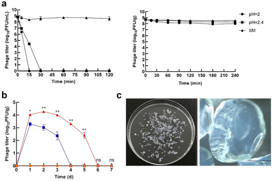 - Śliwka, P.; Mituła, P.; Mituła, A.; Skaradziński, G.; Choińska-Pulit, A.; Niezgoda, N.; Weber-Dąbrowska, B.; Żaczek, M.; Skaradzińska, A. Encapsulation of bacteriophage T4 in mannitol-alginate dry macrospheres and survival in simulated gastrointestinal conditions. Lwt 2019, 99, 238–243. [Google Scholar] [CrossRef]