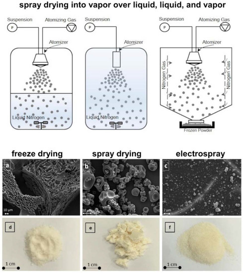 The schematic illustration of spray-drying protocols in vapor over liquid, liquid, and vapor phases(upper, adapted from Adali et al. [114], based on the CC BY 4.0 License), and the comparison of phages lyophilized via freeze-drying (a,d), spray-drying (b,e), and electrospray (c,f). Both SEM images and phage powder form show significant differences in phage formulations (adapted from Ergin et al. [115], based on Elsevier License No. 5375361146341).