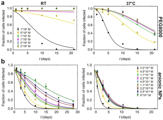 The efficacy of PEG8000 and anionic nanoparticles (NPs) as the thermal-protective additives in adenovirus-based vaccines. (a)—Fraction of cells infected versus storage time for Ad5 stored in the presence of different concentrations of PEG at RT and at 37 °C, (b)—Fraction of cells infected versus storage time in days for Ad5 stored in presence of different concentrations of anionic MUS:OT NPs at RT and at 37 °C. The panel was adapted from Pelliccia et al. [160], based on the CC BY 4.0 License.