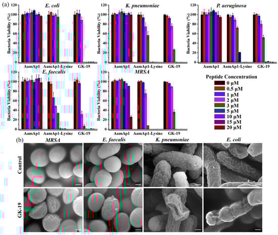 Antibacterial activity of AamAP1, AamAP1-Lys and GK-19. (a) Dose-dependent survival of E. coli, K. pneumoniae, P. aeruginosa, E. faecalis and MRSA treated with different antimicrobial peptides for 12 h. Bacteria (1 × 106 CFU/mL) were incubated with the peptides at concentrations varying from 0 to 20 μM. (n = 5) (b) SEM images of different bacteria after 2 h of incubation with GK-19 at a concentration of 50 μM. Scale bar: 200 nm.