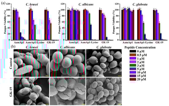 Antifungal activity of AamAP1, AamAP1-Lys and GK-19. (a) Dose-dependent survival of C. krusei, C. albicans and C. glabrata treated with different antimicrobial peptides for 12 h. Fungi (1 × 106 CFU/mL) were incubated with the peptides at concentrations varying from 0 to 20 μM. (n = 5) (b) SEM images of different fungi after 2 h of incubation with GK-19 at a concentration of 50 μM. Scale bar: 1 μm.