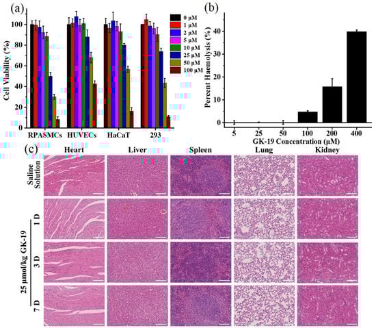 (a) Toxicity of GK-19 to mammalian cells. RPASMCs, HUVECs, HaCaT and 293 cells were cultured in mediums containing different concentrations of GK-19 (0–100 μM) for 48 h. (n = 5). GK-19 caused a negligible toxicity to mammalian cells at effective antimicrobial concentrations. (b) Hemolytic activity of GK-19 on rat erythrocytes. (c) Histology analysis of various organs of the mice treated with saline solution or GK-19 (25 μmol/kg), respectively. The heart, liver, spleen, lungs and kidneys were harvested on days 1, 3 and 7. No observable tissue damage, necrosis or inflammation were observed. Scale bar: 200 μm.