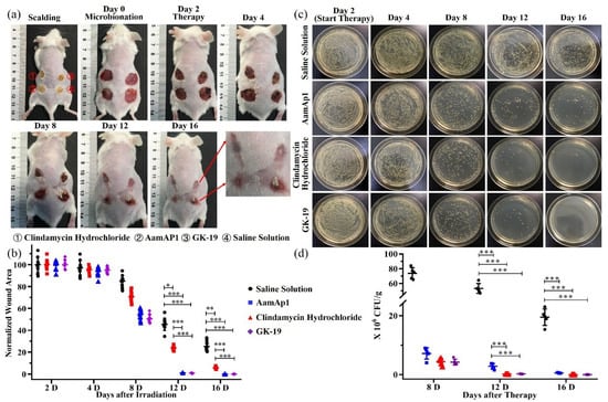 The bactericidal and healing effect of GK-19 on MRSA inoculated onto scalded dorsal skin of mice. (a) Time course images of mice infected by MRSA. Infected dorsal skins of the mice were treated with saline solution, AamAp1, clindamycin hydrochloride, or GK-19, respectively, twice every day (n = 10). The concentrations of drugs was 50 μM. (b) Quantitative analyses of wound areas using Image J software. (c,d) Time course bacterial count in MRSA infected wounds after treatment with different antimicrobial peptides. Skin tissues of different groups were sampled on days 2, 4, 8, 12 and 16. Tissue suspensions were diluted with sterile saline solution and 50 μL of tissue suspensions was then plated in the MHA culture plates. Images were taken 18–24 h after inoculation. The quantitative analyses of colonies were performed using Image J software or visual observation (n = 5). * p < 0.05, ** p < 0.01, *** p < 0.001.