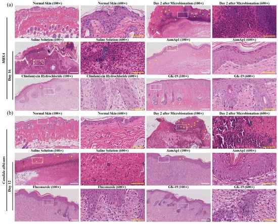 The histology analysis of skin samples of the scalded mice infected by MRSA (a) or C. albicans (b). The skin wounds were treated with saline solution, AamAP1, GK-19, clindamycin hydrochloride (for MRSA infection), or fluconazole (for C. albicans infection), respectively, and the concentration of drugs was 50 μM. Skin samples were harvested at different time points. White scale bar: 200 μm. Yellow scale bar: 50 μm. Yellow arrows indicate the location of bacterial or fungal clumps.