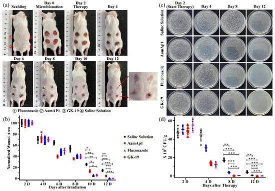 The fungicidal and healing effect of GK-19 on C. albicans inoculated onto scalded dorsal skin of mice. (a) Time course images of mice infected by C. albicans. The infected dorsal skin of mice was treated with saline solution, AamAp1, fluconazole, and GK-19, respectively, twice every day. The concentration of drugs was 50 μM. (b) Quantitative analyses of the wound areas using Image J software (n = 10). (c,d) Time course fungal count in C. albicans infected wounds after treatment with different antimicrobial peptides. Skin tissues of different groups were sampled on days 2, 4, 6, 8, 10 and 12. Tissue suspensions were diluted with sterile saline solution, and 20 μL of tissue suspensions was then plated in PDA culture plates. Images were taken 18–24 h after inoculation. The quantitative analyses of colonies were performed using Image J software or visual observation (n = 5). * p < 0.05, ** p < 0.01, *** p < 0.001.