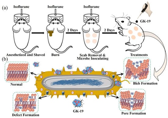 (a) Overall design of the animal experiment. (b) A schematic diagram of the possible mechanisms of antibacterial and antifungal properties of GK-19 in skin and soft tissue infections induced by MRSA or Candida albicans.