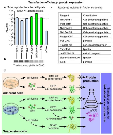 The total expressed reporter levels in adherent cells do not correlate with therapeutic protein production efficacy. (a) Transfection efficacy is assessed by quantitation of luminescence from cell lysate 24 h post-transfection of CHO-K1 adherent cells with pLuc. The top performers are highlighted in green. N = 5. (b) The production of Trastuzumab mAb in CHO 1H7 suspension cell culture in serum-free defined media 7 days after the transient transfection of pDNA. The complexes with PEI were formed at N/P ratio 20, and the complexes with CPPs were formed at CPP/pDNA charge ratio 2.5:1. They were assessed by SDS-PAAG 10%, with Coomassie blue staining. (c) List of reagents included in the further study. (d) A scheme depicting general workflow.