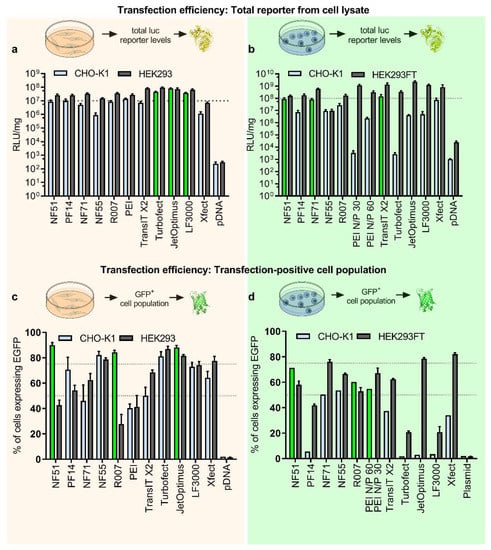 To investigate the transfection efficacies and possibilities for protein production further, we expanded the selection of transfection methods and included CPPs NF71 [16], PF14 [17], and other known examples of polymers and liposomes (Figure 1c). Furthermore, to explore if the abovementioned discrepancy was specific to CHO, we included another cell line, HEK293. HEK293 is a well-established producer cell line because of its ease of use for both cell growth and transfection, as well as its excellent protein yields. HEK293 is frequently utilized as the expression system to produce recombinant proteins and viruses for gene therapies [4]. Again, to be able to compare different reagents, optimal conditions for reagents in HEK cells were determined to maximize the transfection result (Figures S2a,b and S3b,c). We completed luciferase expression with the extended set of transfection methods and observed that the output efficacies were in line with those observed with the initial smaller set in Figure 1a. The top performers were liposomal and polymeric approaches with statistically significantly higher values (Figure 2a, light blue bars, top three are highlighted in green). For the HEK293 cell line, the differences between the methods were smaller, but liposomal and PEI-based approaches were still the top performers (Figure 2a).