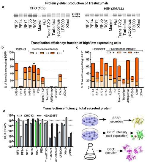 Commercially available transfection reagents included in this work are as follows. Linear polyethyleneimine-based polyethyleneimine HCl MAX (PEI MAX®), MW 40,000 from Polysciences (Warrington, PA, USA) Peptide-based transfection reagent Reagent007 from Icosagen (San Francisco, CA, USA). From Thermo Fisher Scientific (Waltham, MA, USA), two reagents, Lipofectamine™3000 (LF3000) Transfection Reagent as a lipid nanoparticle-based technology, and Turbofect as a lipid-based cationic polymer transfection reagent were chosen. Xfect™ from Takara Bio (Tokyo, Japan) was characterized as a biodegradable transfection polymer suitable for both CHO and HEK, and adherent or suspension cells. From Polyplus (Berkeley, CA, USA) jetOPTIMUS® was chosen, which is characterized as a cationic transfection reagent suitable for transient and stable gene expression in mammalian cell culture. From Mirus Bio (Madison, WI, USA) TransIT X2® was chosen, which is characterized as a non-liposomal polymeric transfection system.