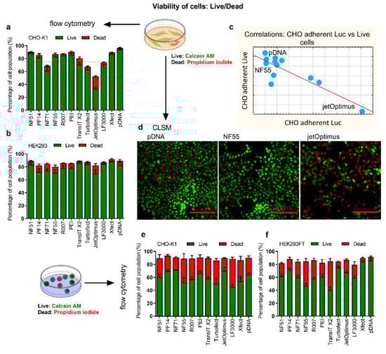 Cell viability post-transfection was assessed by the live/dead assay. Adherent (a) CHO-K1 cells and (b) HEK293 cells were transfected with 0.5 µg of pLuc per 24-well plate well. CPP/pDNA complexes were formed at CR3:1, and PEI complexes at N/P20. Analysis was done 24 h post-transfection. Calcein AM (live) and PI (dead) were added to detect live and dead cells. (c) The correlation graph depicting correlations between luciferase expression levels against viability of cells in adherent cell experiments. (d) The representative confocal images of cells 24 h post-treatment with pDNA, and cells transfected using jetOPTIMUS (jetOptimus) or NF55 (NF55). The red bar corresponds to 200 µm. Suspension (e) CHO K1 and (f) HEK293FT cells were transfected in serum-free media with 0.75 µg of pSEAP. CPP/pDNA complexes were formed at CR2:1, and PEI/pDNA at N/P20 (HEK293FT) or N/P60 (CHO-K1). 48 h post-transfection cells were collected, and Calcein AM and PI were added to detect live and dead cells from the whole cell population. N ≥ 3.