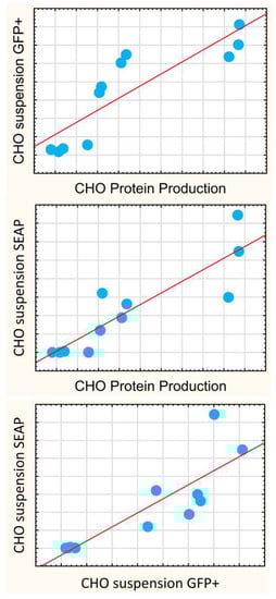 The most significant conclusions from the above are as follows. First, in CHO, the protein production yields correlated with both the suspension expressions of SEAP (r = 0.88, p < 0.05) and GFP+ population (Figure 5, r = 0.86, p < 0.05), but did not correlate with luciferase quantitation in neither adherent nor suspension media (Supplementary Table S3, Figure S15). This forced us to conclude a surprising implication: luciferase reporter quantitation assay, despite its excellent technical aspects, is not a good screening assay for predicting efficacies in protein expression. Conversely, the application of SEAP and GFP reporters should be encouraged as these create valuable data that can be used for protein production.
