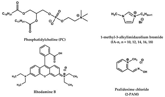Lipoid E PC (Phosphatidylcholine from egg) with a purity of 98% was a gift from Lipoid GmbH (Ludwigshafen, Germany). 1-methyl-3-alkylimidazolium bromide (IA-n, n = 10, 12, 14, 16, 18) was synthesized according to previously described procedures [,]. Rhodamine B (Sigma-Aldrich, St. Louis, MO, USA, ≥95%), and pyridine-2-aldoxime methochloride (2-PAM) (Sigma-Aldrich, St. Louis, MO, USA, ≥97%) were used for loading in liposomes. Purified water (18.2 MΩ cm resistivity at 25 °C) from Direct-Q 5 UV equipment (Millipore S.A.S., Molsheim, France) was used for the preparation of all solutions.