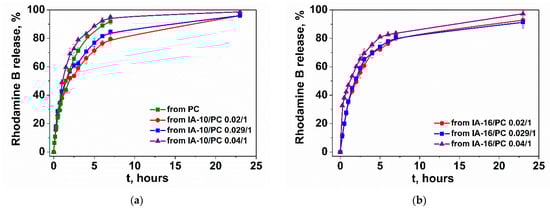 To assess the release rate of rhodamine B from the modified liposomes, a dialysis technique was applied using a spectrophotometric method. For this, during dialysis, an aliquot of the external solution was taken at regular intervals and the absorption spectra of rhodamine B were recorded (Figures S2–S6). According to the results of spectrophotometric analysis, the dependences of the release of rhodamine B on time were plotted for different liposomal solutions (Figure 3 and Figure S7). Analysis of the data shows that rhodamine B is released from PC liposomes for about 4 h, and its encapsulation in modified liposomes allows an increase in the release time of the probe (Figure 3). During 9 h of dialysis, about 80% of the substrate was released from the modified liposomes.