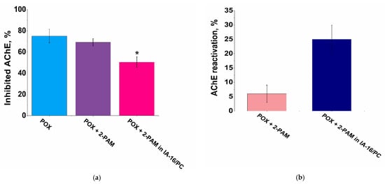 The effectiveness of modified liposomes loaded with 2-PAM was evaluated to reactivate brain AChE after poisoning with sublethal dose of POX (0.6 mg/kg, intraperitoneally). It has been shown that free 2-PAM cannot reactivate brain AChE (Figure 8). However, administration of 2-PAM in liposomal form significantly reduces the inhibition of brain AChE from 75 ± 6% to 50 ± 5% in the case of the IA-16/PC (surfactant/lipid molar ratio of 0.029/1) (Figure 8a). Thus, liposomes IA-16/PC with 2-PAM reactivate brain AChE by 25 ± 5% (Figure 8b). High values of AChE reactivation in the brain are another preliminary evidence of BBB penetration that signify the potential of IA-16/PC liposomes to enhance current treatment of OP-induced neurodegeneration.