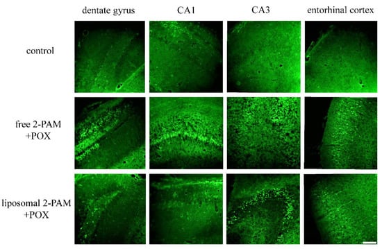 Representative microphotographs of Fluoro-Jade B staining showing the neuroprotective effect of liposomes loaded with 2-PAM following POX poisoning in the dentate gyrus, CA1, and CA3 areas of the hippocampus and in the entorhinal cortex of mice. Scale bar 100 μm.