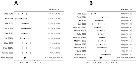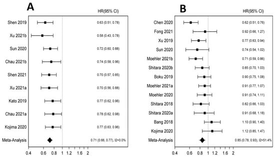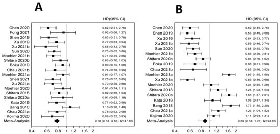 (A): Forest plot for overall survival in the total population. (B): Forest plot for progression free survival in the total population [,,,,,,,,,,,,,,,,].