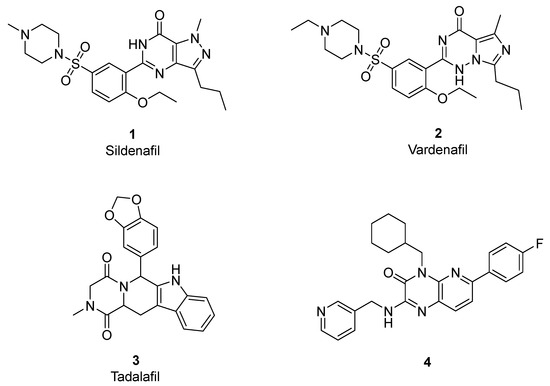 Phosphodiesterase enzyme (PDE) plays an important role in regulating the intracellular level of cyclic guanosine monophosphate (cGMP), the second messenger of nitric oxide [1,2,3,4]. cGMP is hydrolyzed by phosphodiesterase enzyme into its inactive metabolite 5′-GMP which mediates a significant elevation of intracellular calcium concentration, resulting in vascular constriction [1,5]. Eleven subtypes of phosphodiesterase family have been described (PDE1–11) [6]. PDE5 is expressed mainly in vascular smooth muscle cells, lung, kidney, and platelets [5,7,8]. Inhibition of PDE5 results in elevation of cGMP and finally leads to vascular relaxation and reduction in systemic blood pressure [9,10]. Therefore, PDE5 inhibitors can be considered potential antihypertensive and antianginal agents. Moreover, the discovery of sildenafil (1, Viagra®, PDE5 inhibitor) revealed its potential use in the treatment of male erectile dysfunction [1,5,8,11,12]. Recently, it was approved for the treatment of pulmonary hypertension (Revatio®) [1,12]. In addition, it was reported for the treatment of cardiac hypertrophy [13,14]. Further structural optimization of sildenafil has driven the development of a new PDE5 inhibitor agent such as vardenafil (2, Levitra®) [1,7,15] and tadalafil (3, Cialis®) [1,16] (Figure 1).