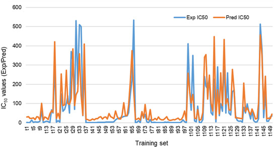 Overview of the graphical presentation of PDE5 IC50 of training set (t1–150) shows correlation between the experimental (blue color) and predicted (red color) IC50 values.
