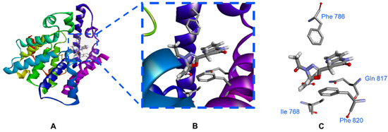 The expected binding interaction between the most active compound (11b) and PDE5 protein (PDB ID: 3HC8). (A) the 3D conformation of PDE5 protein with the allocated compound 11b in the active site; (B) the condensed view of the PDE5 active site showed the key amino acid residues and their close distance to compound 11b binding motifs (pyridopyrazinone scaffold and terminal aryl group); (C) the isolated view of PDE5 active site showed compound 11b with significant interactions with the key amino acid residues in the PDE5 active site (Phe 768, hydrophobic interaction with terminal phenyl ring; Phe 786, hydrophobic interaction with pyridopyrazinone ring; Gln 817, HB interaction with 4-NO2 group; and Phe 820, hydrophobic interactions with both central oxadiazole ring and pyridopyrazinone ring).