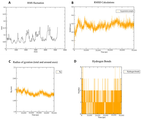 Molecular dynamic (MD) analysis of ligand 11b into PDE5 protein (PDB ID: 3HC8). (A) RMSF values of PDE5 residues during 50 ns MD simulations; (B) RMSD of ligand (11b) and protein (PDE5) backbone obtained from 50 ns MD simulation; (C) radius of gyration (Rg) showing no drastic folding of PDE5 during the 50 ns MD simulation; (D) assessment of the number of H-bonds formed between the ligand (11b) and the target (PDE5) during 50 ns MD simulations.