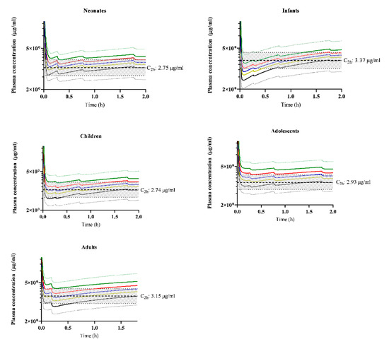 Under 40 and 50%-reduced CO conditions, the percentage of virtual subjects achieving target plasma concentration ranged between 7–59% across all age groups (Figure 4). A 15% reduction in the total dose administered in neonates, infants and children and a 25% dose reduction in the total dose administered in adolescents and adults (see Supplementary Materials, Table S4, for actual dosing schedule) resulted in an increase in the number of subjects achieving the target plasma concentration across all age groups, with up to 89% of the virtual population achieving the target concentration range in adults with 40%-reduced CO. (Figure 4).
