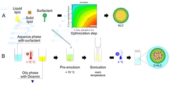 Scheme of production of blank NLCs (A) and diosmin-loaded nanoparticles (D-NLCs, (B)).