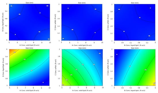 Contour plot of the effect of independent variables (from left to right: solid lipid concn. versus liquid lipid concn., solid lipid concn. vs. surfactant concn. and liquid lipid concn. vs. surfactant concn.) on the size of NLCs using Softisan® 100 (top) and Gelucire® 44/14 (bottom row).